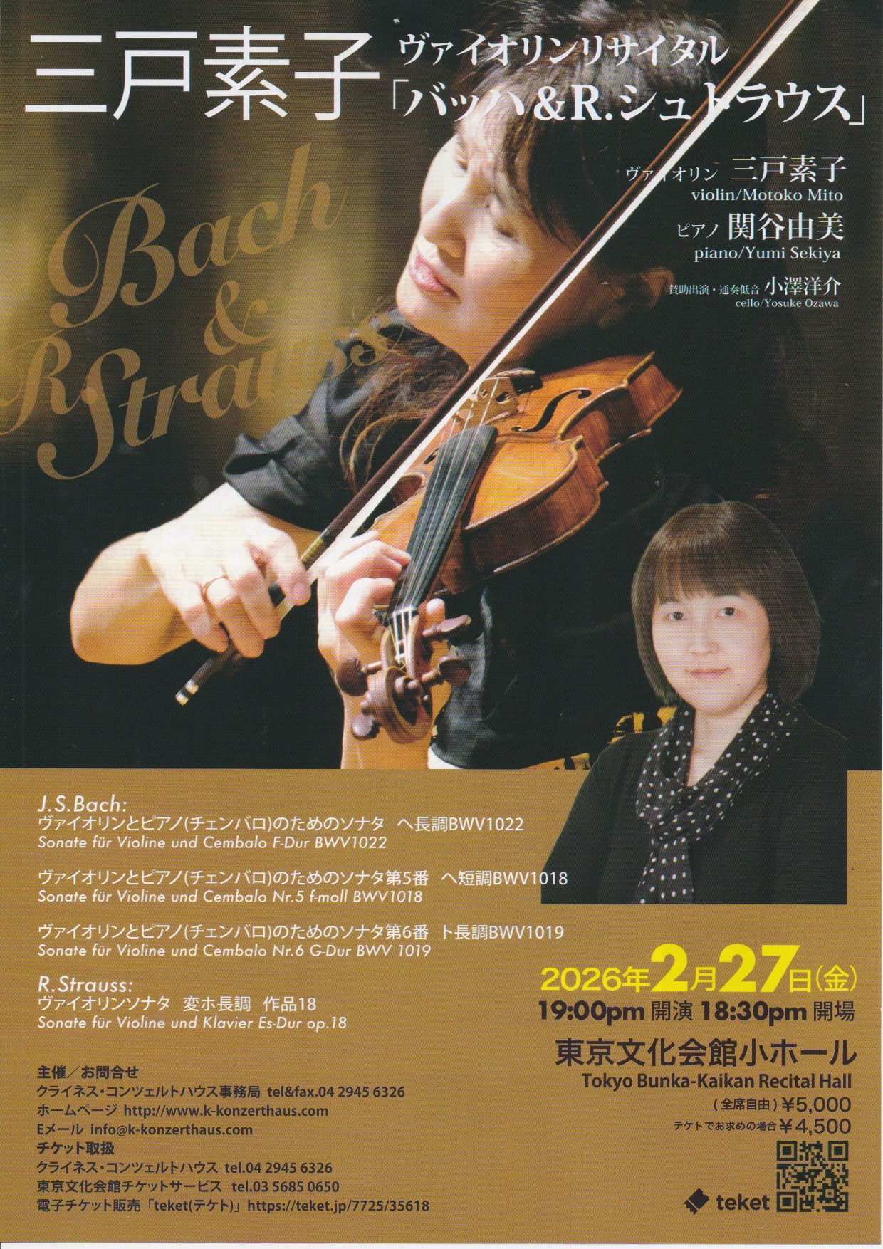 通奏低音が加わることで、和声の立体感と響きの奥行きがより鮮明になります。バッハの緻密な対話の世界から、後半のR.シュトラウス《ヴァイオリンソナタ 変ホ長調 作品18》へと続く、時代を越えた充実のプログラムです。